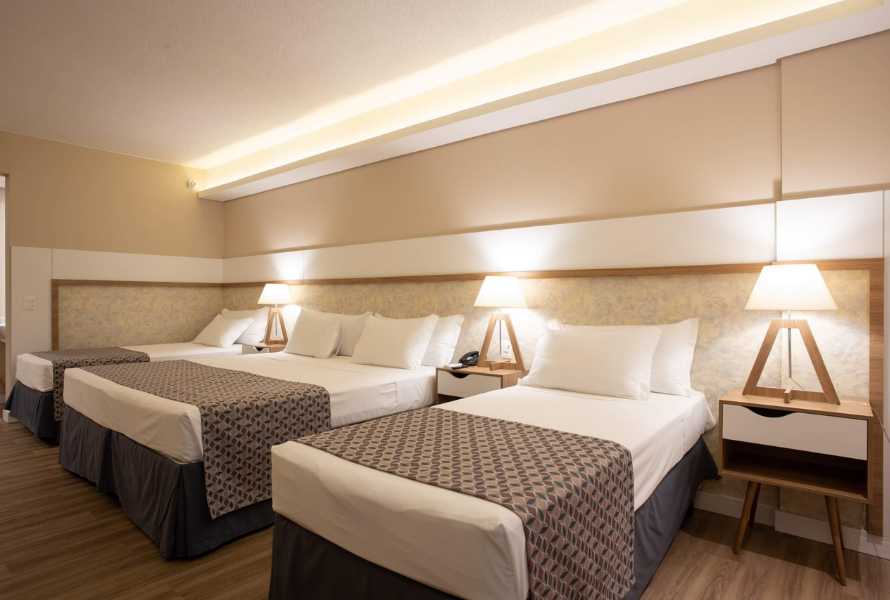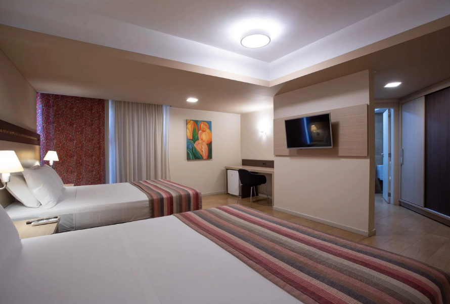 Os apartamentos Luxo são ideais para famílias, oferecendo acomodações modernas com cama box, ar-condicionado individual, internet, frigobar, TV LCD, secador e cofre, acomodando até 4 pessoas.