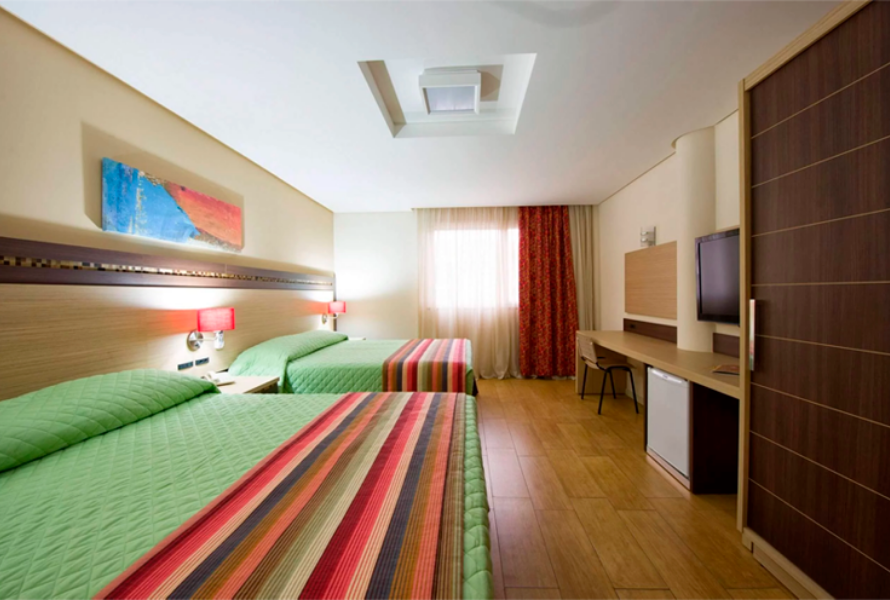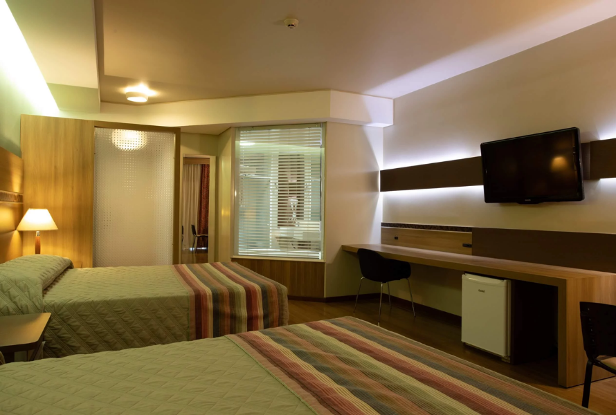 Um apartamento moderno, equipado com cama box, ar-condicionado individual, internet, frigobar, TV LCD, secador e cofre, acomodando até 2 pessoas com todo o conforto necessário.